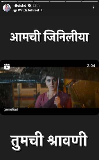 एक व्हिडीओ पोस्ट करत कॅप्शनमध्ये जिनिलीयाने लिहिलं होतं, “रिक्षातून भर पावसात तिचा उजवा पाय बाहेर पडतो. ती छत्री उघडते आणि पहिल्यांदा पडद्यावर दिसते. ‘श्रावणी’चं टाळ्या, शिट्ट्यांनी तुम्ही स्वागत केलं. पण ते माझं ही मराठी चित्रपट जगातलं पहिलं पाऊल होतं. तुम्ही श्रावणीला दिलेल्या प्रचंड प्रतिसादाबद्दल मनापासून धन्यवाद.” आता तिचा हा व्हिडीओ रितेशने शेअर केला आणि लिहिलं, “आमची जिनिलीया…तुमची श्रावणी.”