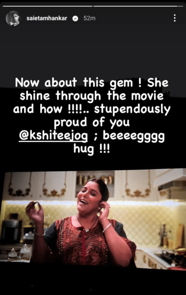 सई ताम्हणकर सर्वप्रथम ‘रॉकी और रानी की प्रेम कहानी’ या चित्रपटाचे कौतुक करताना लिहिते, “सर्वांचे मनोरंजन करणारा उत्तम चित्रपट…रणवीर सिंह आणि आलिया भट्ट यांनी नेहमीप्रमाणे त्यांच्या भूमिका फारच सुंदर केल्या आहेत. करण जोहर सर, तुम्ही अप्रतिम कलाकृती सादर केली आहे. आता मी आमच्या मौल्यवान रत्नाबद्दल सांगते. क्षिती… संपूर्ण चित्रपटात तू कमाल केली आहेस. या क्षणाला तुझा खूप जास्त अभिमान वाटत आहे. माझ्याकडून तुला घट्ट मिठी आणि खूप प्रेम!”