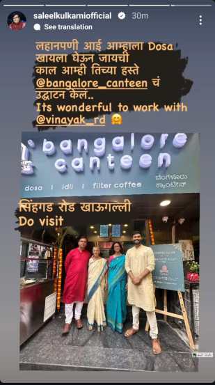 ३० जूनला सलील कुलकर्णींनी या दोन चांगल्या बातम्या जाहीर केल्यानंतर काल, ६ जूनला बँगलोर कँटिनची फ्रँचायझी सिंहगड रोडच्या खाऊगल्ली सुरू केली आहे. सलील कुलकर्णींच्या आईच्या हस्ते त्यांच्या हॉटेलचं उद्घाटन झालं. याचा फोटो त्यांनी इन्स्टाग्राम स्टोरीला शेअर करत लिहिलं आहे, “लहानपणी आई आम्हाला डोसा खायला घेऊन जायची. काल आम्ही तिच्या हस्ते बँगलोर कँटिनचं उद्घाटन केलं. नक्की भेट द्या सिंहगड रोड खाऊगल्ली येथील बँगलोर कँटिनला.”