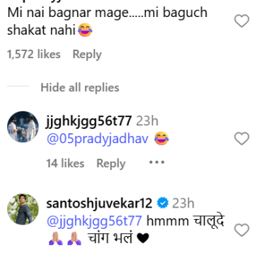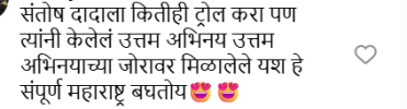 अभिनेत्याच्या या फोटोवर अनेक चाहत्यांनी कमेंट्स केल्या आहेत. काहींनी त्याला ट्रोलिंगकडे दुर्लक्ष करण्याचा सल्ला दिला आहे. काहींनी त्याच्या अभिनयाचे कौतुक केले आहे, तर काहींनी त्याच्या मुलाखतीतील वक्तव्यांवरून खिल्ली उडवली आहे. एका नेटकऱ्याने लिहिले, “संतोष दादाला कितीही ट्रोल करा, पण त्याने केलेला उत्तम अभिनय आणि त्याच्या जोरावर मिळालेले यश हे संपूर्ण महाराष्ट्र बघतोय.”
