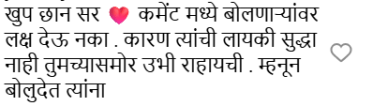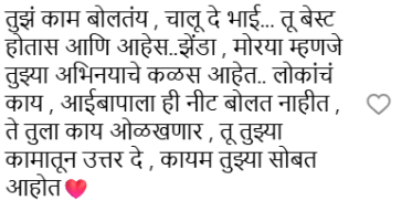 दुसऱ्या एका नेटकऱ्याने लिहिले, “तुझं काम बोलतंय, चालू दे भाई, तू बेस्ट होतास आणि आहेस. ‘झेंडा’, ‘मोरया’ हे चित्रपट म्हणजे तुझ्या अभिनयाचे कळस आहेत. लोकांचं काय, आईबापालाही नीट बोलत नाहीत, ते तुला काय ओळखणार. तू तुझ्या कामातून उत्तर दे, आम्ही कायम तुझ्याबरोबर आहोत.” आणखी एका नेटकऱ्याने लिहिले, “खूप छान सर, कमेंटमध्ये बोलणाऱ्यांवर लक्ष देऊ नका, कारण त्यांची लायकीसुद्धा नाही तुमच्यासमोर उभी राहायची.”