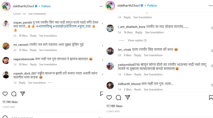 रणवीर सिंगच्या नादी लागू नको, वाण नाही पण गुण लागला, रणवीरचा नाद सोड, तुला रणवीर सिंग चावला की काय? अशा अनेक कमेंट नेटकऱ्यांनी केल्या आहेत. तर काहींनी सिद्धार्थच्या या लूकचं कौतुकही केलं आहे.