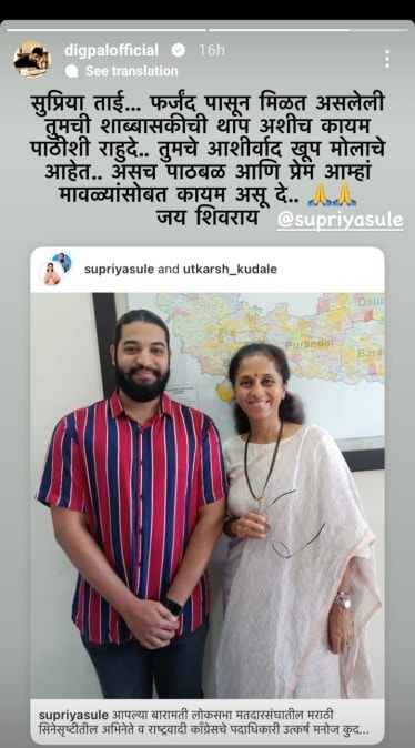 सुप्रिया सुळे यांच्या याच पोस्टचा फोटो दिग्पाल लांजेकर यांनी इन्स्टाग्राम स्टोरीवर शेअर करून आभार मानले आहेत. दिग्पाल यांनी लिहीलं की, “सुप्रिया ताई…’फर्जंद’पासून मिळत असलेली तुमची शाब्बासकीची थाप अशीच कायम पाठीशी राहुदे…तुमचे आशीर्वाद खूप मोलाचे आहेत…असच पाठबळ आणि प्रेम आम्हा मावळ्यांबरोबर कायम असू दे… जय शिवराय..”