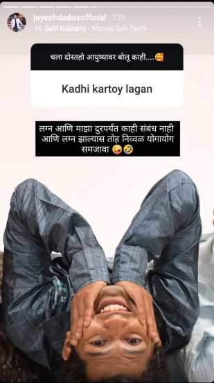 एका चाहत्याने जयेशला विचारलं की, लग्न कधी करतोय? तेव्हा अभिनेता म्हणाला, “लग्न आणि माझा दूरपर्यंत काही संबंध नाही. लग्न झाल्यास तो निव्वळ योगायोग समजावा.”