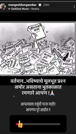 मंगेशनं त्याच्या इन्स्टाग्रामवर एक कार्टून चित्र असलेली पोस्ट शेअर केली आहे. या पोस्टमध्ये महागाई, बेरोजगारी, गुंडगिरी, हत्या, कायदा, शेतकरी आत्महत्या, आर्थिक परिस्थिती, पाणी समस्या आणि असे राज्यातील अनेक प्रश्न असलेली कार्डे ठेवण्यात आली आहेत. मात्र, या सगळ्यात ‘औरंगजेबाची कबर’ असं लिहिलेलं एक कार्ड आहे आणि इतर सर्व कार्डांपेक्षा त्याला महत्त्व देण्यात आलं आहे. हेच कार्टून मंगेशनं शेअर करीत असं म्हटलं आहे, “वर्तमान…. भविष्याचे मूलभूत प्रश्न समोर असताना भूतकाळात रमणारे आपण. आपल्याला शत्रूची गरज नाही; आपणच पुरे आहोत!”