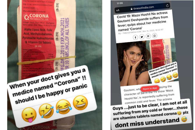 ‘माझा होशील ना’ मालिकेत सईची भूमिका साकारणारी अभिनेत्री गौतमी देशपांडे सध्या सोशल मीडियावर चर्चेत आहे. चर्चेचं कारण म्हणजे तिने पोस्ट केलेला ‘करोना’ गोळ्यांच्या पाकिटाचा फोटो. या फोटोमधील गोळ्यांच्या पाकिटावर ‘करोना’ हे नाव बघून नेटकऱ्यांना आश्चर्याचा धक्काच बसलाय.