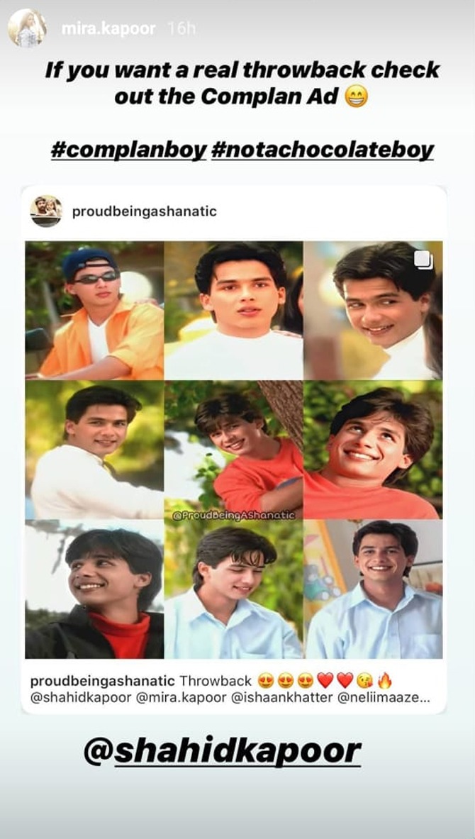 “शाहिद फक्त चॉकलेट बॉय नाही. जर तुम्हाला खरंच शाहिदचे थ्रोबॅक फोटो पाहायचे असतील तर कॉम्पॅनची जाहिरात पाहा. #complanboy #notachocolateboy”, असं कॅप्शन मीराने या फोटोला दिलं आहे. तिने तिच्या इन्स्टा स्टोरीमध्ये हा फोटो शेअर केला आहे.