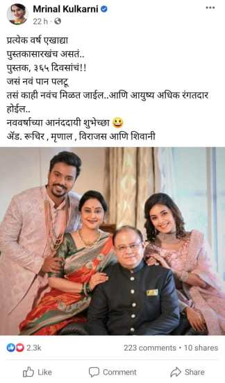 मृणाल कुलकर्णी यांनी फॅमिली फोटो शेअर करत पोस्टच्या कॅप्शनमध्ये लिहिलं, “प्रत्येक वर्ष एखाद्या पुस्तकासारखंच असतं…पुस्तक, ३६५ दिवसांचं! जसं नवं पान पलटू तसं काही नवंच मिळत जाईल.. आणि आयुष्य अधिक रंगतदार होईल…नववर्षाच्या आनंददायी शुभेच्छा ! अॅड. रूचिर, मृणाल विराजस आणि शिवानी.”