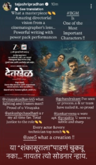 आता अभिनेत्री तेजश्री प्रधाननेदेखील ‘देवखेळ’चे कौतुक केले आहे. इन्स्टाग्रामवर तिने एक स्टोरी शेअर केली असून, या वेब सीरिजबद्दल तिने तिचे मत व्यक्त केले आहे.