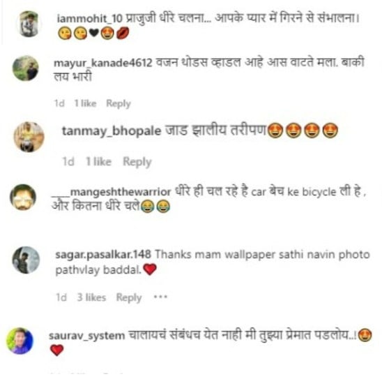 प्राजक्ताचे हे फोटो नेटकऱ्यांना प्रचंड आवडले आहेत. प्राजक्ताची स्तुती करत एक नेटकरी म्हणाला, “प्राजुजी धीरे चलना… आपके प्यार में गिरने से संभालना.” दुसरा नेटकरी म्हणाला, “चालायचं संबंधच येत नाही मी तुझ्या प्रेमात पडलोय.” तिसरा नेटकरी म्हणाला, “वॉलपेपरसाठी नवीन फोटो पाठवल्याबद्दल, धन्यवाद मॅम.” आणखी एक नेटकरी म्हणाला, “हळूच जातोय कार विकून सायकल घेतली, आणखी किती हळू चालू.” आणखी एक नेटकरी म्हणाला, “वजन थोडसं वाढलयं अस मला वाटतं, बाकी लय भारी.” दुसरा नेटकरी म्हणाला, “जाड झालीस पण तरी पण सुंदर आहेस.”