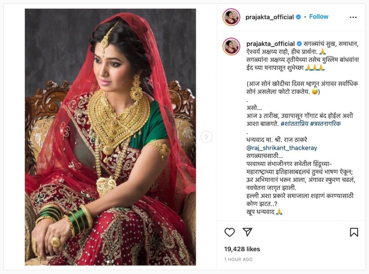प्राजक्ताने तिच्या इन्स्टाग्राम अकाऊंटवरून ही पोस्ट शेअर केली होती. या पोस्टमध्ये प्राजक्ताने पारंपारिक वेशभूषा केल्याचे दिसत आहे. यासोबतच तिने वर्तमानपत्रात असलेल्या एका लेखाचा फोटो शेअर केला होता. या लेखात मशिदींवरील बेकायदेशीर भोंगे उतरवण्याचे आदेश हायकोर्टाने सरकारला दिले आहेत. ही पोस्ट शेअर करत प्राजक्ताने लिहिलं, “सगळ्यांचं सुख, समाधान, ऐश्वर्य अक्षय्य राहो, हीच प्रार्थना. सगळ्यांना अक्षय्य तृतीयेच्या तसेच मुस्लिम बांधवांना ईदच्या मनापासून शुभेच्छा. (आज सोनं खरेदीचा दिवस म्हणून अंगावर सर्वाधिक सोनं असलेला फोटो टाकतेय.)”
