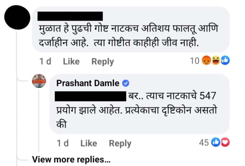 या बातमीवर कमेंट करत एका नेटकऱ्याने लिहिलं “मुळात हे पुढची गोष्ट नाटकच अतिशय फालतू आणि दर्जाहीन आहे. त्या गोष्टीत काहीही जीव नाही.” नेटकऱ्याच्या या कमेंटवर प्रशांत दामले यांनीही त्यांच्या स्टाईलने सडेतोड उत्तर दिलं आहे. त्यांनी लिहिलं, “बरं… त्याच नाटकाचे ५४७ प्रयोग झाले आहेत. प्रत्येकाचा दृष्टिकोन असतो की.” त्यांच्या या उत्तराने सर्वांचं लक्ष वेधलं आहे.