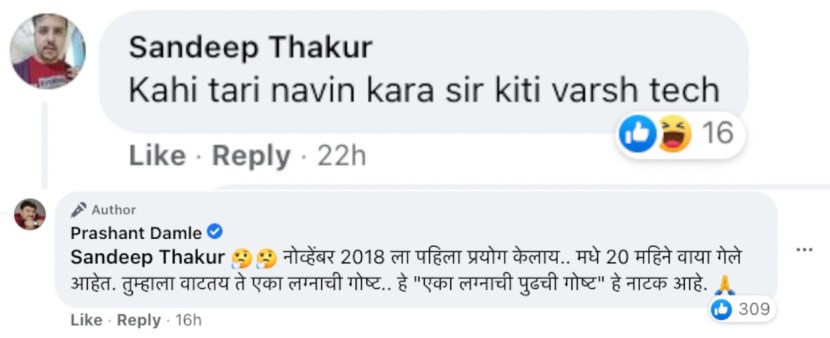 त्यांच्या एका लग्नाची पुढची गोष्ट या नाटकाचे लवकरच ५०० प्रयोग पूर्ण होणार आहेत. त्यासाठी त्यांनी एक पोस्ट त्यांच्या फेसबूकवर शेअर केली आहे. या पोस्टवरून त्यांना एका नेटकऱ्यांने ट्रोल केले आहे. नेटकरी त्यांना ट्रोल करत म्हणाला, काही तरी नवीन करा सर किती वर्ष तेच करणार. नेटकऱ्याच्या कमेंटने प्रशांत यांचे लक्ष वेधले आहे. या नेटकऱ्याला उत्तर देत प्रशांत म्हणाले, नोव्हेंबर २०१८ ला पहिला प्रयोग केलाय.. मधे २० महिने वाया गेले आहेत. तुम्हाला वाटतय ते एका लग्नाची गोष्ट.. हे “एका लग्नाची पुढची गोष्ट” हे नाटक आहे.
