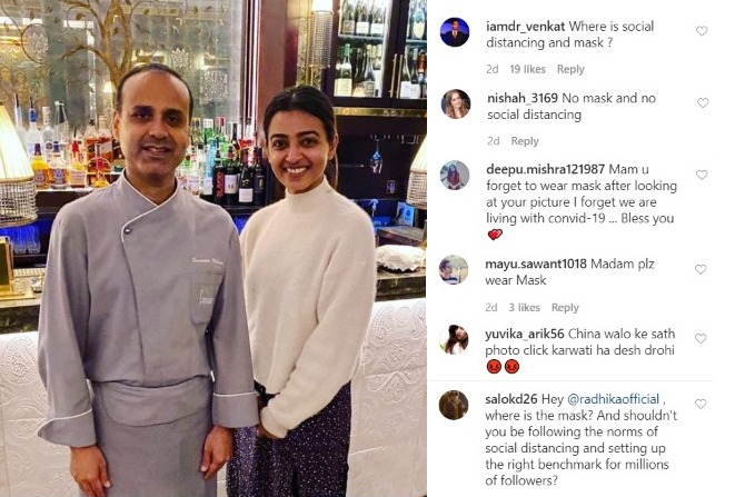 राधिकाने लंडनमधील एका प्रसिद्ध भारतीय रेस्तराँमधील फोटो शेअर केला होता. यात ती शेफ सुरेंद्र मोहन यांच्यासोबत दिसून येत आहे. परंतु, या फोटोमध्ये राधिका आणि शेफ या दोघांनीही मास्क लावलेला नाही तसंच सोशल डिस्टंन्सिंगच्या नियमांचं पालनही करताना दिसत नाही. त्यामुळे राधिकाला अनेकांनी ट्रोल केलं आहे.