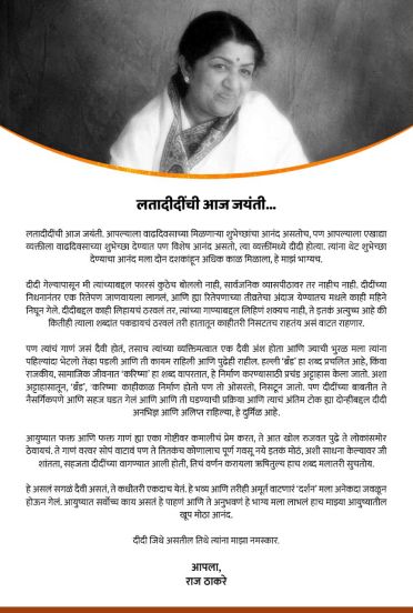 राज ठाकरे यांनी जाहीर केलेल्या निवेदनात म्हटलं, “लतादीदींची आज जयंती. आपल्याला वाढदिवसाच्या मिळणाऱ्या शुभेच्छांचा आनंद असतोच, पण आपल्याला एखाद्या व्यक्तीला वाढदिवसाच्या शुभेच्छा देण्यात पण विशेष आनंद असतो, त्या व्यक्तींमध्ये दीदी होत्या. त्यांना थेट शुभेच्छा देण्याचा आनंद मला दोन दशकांहून अधिक काळ मिळाला, हे माझं भाग्यच. दीदी गेल्यापासून मी त्यांच्याबद्दल फारसं कुठेच बोललो नाही, सार्वजनिक व्यासपीठावर तर नाहीच नाही. दीदींच्या निधनानंतर एक रितेपणा जाणवायला लागला, आणि ह्या रितेपणाच्या तीव्रतेचा अंदाज येण्यातच मधले काही महिने