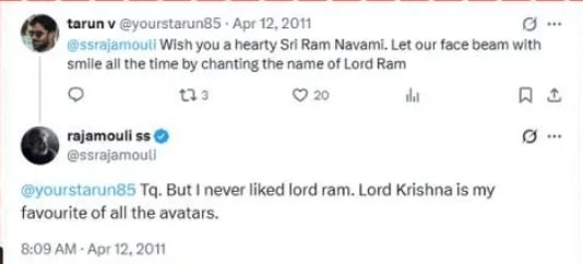 राजामौलींनी केलेलं हे वक्तव्य व्हायरल झालं आणि सोशल मीडियावर यासंबंधित अनेक प्रतिक्रिया यायला सुरू झाल्या. काहींनी पाठिंबा दिला तर काहींनी टीका केली, यामुळे त्यांचं २०११ सालचं जुनं ट्विटही व्हायरल झालं, ज्यामध्ये त्यांनी प्रभू श्रीरामांबद्दल वक्तव्य केलेलं. नेटकऱ्यांनी त्यांच्या ट्विटचे फोटो काढून त्यांच्यावर टीका केली, तर काहींनी राजामौलींनी या वक्तव्यानंतर स्पष्टीकरण दिलेलं असंही म्हटलं. राजामौलींनी यासंबंधित असं स्पष्टीकरण दिलेलं की, “मला राम कधीच आवडले नाही, भगवान श्री कृष्ण माझे आवडते आहेत; त्यांचे सगळे अवतार मला आवडतात.”