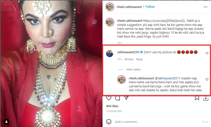 रितेशच्या या पोस्टवर राखी सावंतनेही कमेंट करत रिप्लाय दिला आहे. त्यावर राखी सावंत म्हणाली की, ‘तुझे नाटक बंद कर’. यावर रितेशनही तिला प्रत्युत्तर दिले आहे. तो म्हणाला की, ‘तू ड्रामा क्वीन आहेस’. यानंतर राखीने रितेशला कमेंट करत ‘माझा फोटो वापरु नको’, असे सांगितले. त्यावर उत्तर देताना रितेश म्हणाला, “मॅडम, तुम्ही माझे नाव वापरणे बंद करा आणि मी तुमचे चित्र वापरणे बंद करेन. तुम्ही मला एका गेम शोमध्ये भेटा. मग मी तुम्हाला सांगेन.”