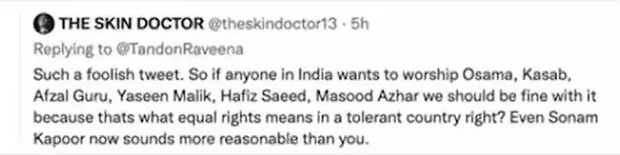 “आम्ही सहनशील आहोत, होतो आणि राहू. भारत हा एक स्वतंत्र देश आहे, इथे कोणालाही कोणाचीही पूजा करता येते. इथे सर्वांना समान अधिकार आहेत.” अशा प्रकारचं ट्विट रवीनाने केलं होतं. या तिच्या ट्विटनंतर अनेकांनी तिला ट्रोल करण्यास सुरुवात केली. एका युजरने ट्विट करत म्हटलं की, “किती मुर्खासारखं ट्विट केलं आहे. भारतात ओसामा, कसाब, अफजल गुरु, यासीन मालिक, हाफिज सईद, मसीद अजहर यांची पूजा करण्याची कोणाची इच्छा असेल तर ते ठिक आहे का? कारण सहिष्णू देशात समान अधिकारांचा अर्थ असाच असतो. सोनम कपूर तुझ्यापेक्षा अधिक समजूतदार आहे.”