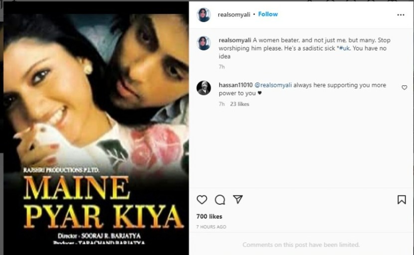 बॉलिवूडची अभिनेत्री आणि सलमान खानची एक्स गर्लफ्रेंड सोमी अली पुन्हा एकदा चर्चेत आहे. सोमीने तिच्या इन्स्टाग्राम अकाऊंटवरुन सलमान खानवर जोरदार टीका केली आहे. सलमान आणि भाग्यश्रीच्या ‘मैने प्यार किया’ या चित्रपटाचे पोस्टर शेअर करत सोमी अलीने लोकांना सलमान खानची पूजा करणे बंद करण्याचे आवाहन केले आहे. अभिनेत्रीने कॅप्शनमध्ये सलमान खानचे नाव लिहिले नाही, मात्र फोटो शेअर करताना तिने अभिनेत्यावर काही गंभीर आरोप केले आहेत.