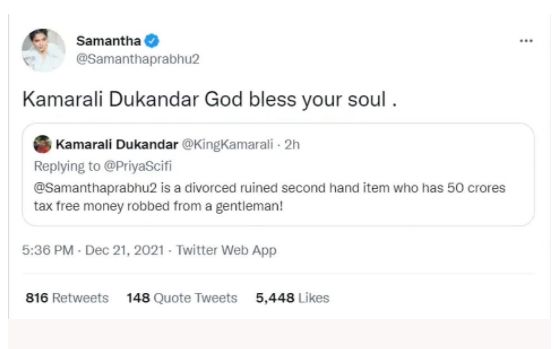 नुकताच एका यूजरने ट्विटरवर समांथाला टॅग करत एक ट्वीट केले. ‘घटस्फोटीत समंथाने एका चांगल्या व्यक्तीकडून करमुक्त ५० कोटी रुपये उकळले आहेत’ या आशयाचे ट्वीट करत एका यूजरने तिला ट्रोल केले होते. त्यावर समांथाने उत्तर देत ‘देव तुमच्या आत्म्याला शांती देवो’ असे म्हटले आहे.