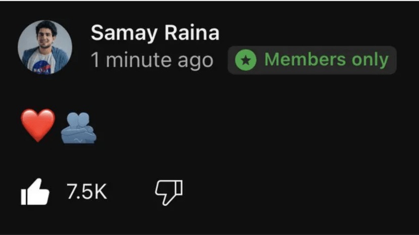 समय रैनाने त्याच्या यूट्यूबवर एक पोस्ट शेअर केली आहे. ही पोस्ट त्याच्या यूट्यूबचे मेंबर्स असलेल्यांना दिसत आहे. त्याच्या या पोस्टमध्ये त्याने हार्ट इमोजी शेअर केली आहे. त्याने पोस्ट शेअर केल्यानंतर एका मिनिटातच सात हजार लोकांनी लाइक केले, तर २४०० लोकांनी कमेंट केल्या. एका रेडिट युजरने समय रैनाच्या पोस्टचा स्क्रीनशॉट शेअर करीत लिहिले, “सध्या इंटरनेटवर कोणी इतके मोठे व्यक्तिमत्व आहे का?”, एका चाहत्याने कमेंटमध्ये लिहिले की “तो बरा असेल, अशी आशा आहे.”