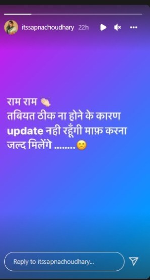 सपना चौधरी ही इन्स्टाग्रामवर कायमच सक्रीय असते. तिने नुकतंच इन्स्टाग्रामवर एक स्टोरी शेअर केली आहे. यात तिने तिची तब्येत खराब असल्याचे सांगितले आहे. यावर पोस्ट करताना सपना चौधरी म्हणाली, ‘राम राम, प्रकृती अस्वास्थ्यामुळे मी अपडेट देऊ शकणार नाही. माफ करा, लवकरच भेटू.’