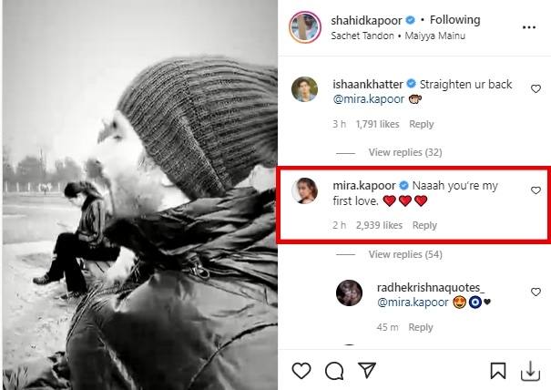 दरम्यान शाहिदने हा व्हिडीओ शेअर केल्यानंतर अवघ्या काही मिनिटात मीराने त्यावर प्रतिक्रिया दिली आहे. यात तिने शाहिदच्या पहिल्या प्रेमाबद्दलाच दावा खोडून काढला आहे. “नाही तू माझे पहिले प्रेम आहेस” अशी कमेंट करत तिने हार्ट इमोजी शेअर केले आहेत. या दोघांच्या या रोमँटिक व्हिडीओवर अनेक कलाकारांच्या प्रतिक्रिया पाहायला मिळत आहेत.