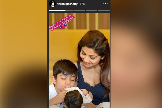 १५ फ्रेबुवारी रोजी शिल्पा दुसऱ्यांदा आई झाली. तिने सरोगसीद्वारे एका गोंडस मुलीला जन्म दिला. तिच्या मुलीचं नाव समिषा असं असून ती तीन महिन्यांची झाली आहे. त्यामुळेच शिल्पाने तिच्यासोबतचा एक छान फोटो शेअर केला. या फोटोमध्ये तिच्यासोबत मुलगा वियानदेखील दिसून येत आहे. “तीन महिने झाले अभिनंदन. माझी राजकुमारी समिषा”, असं कॅप्शन शिल्पाने या फोटोला दिला. सध्या नेटकऱ्यांमध्ये या फोटोची चर्चा सुरु आहे.