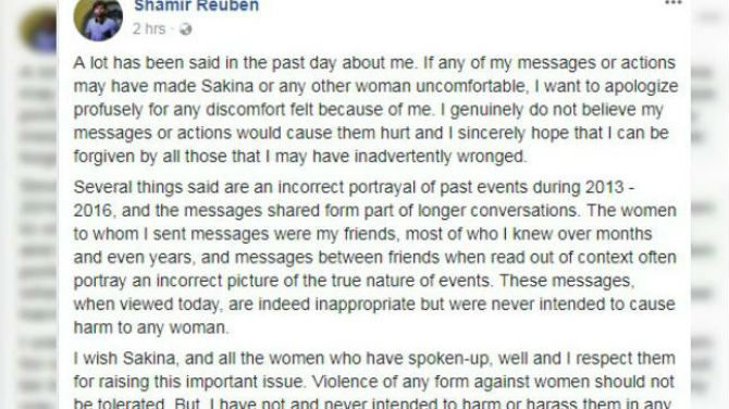 सकिनाच्या या पोस्टनंतर शामिरने आपल्याकडून झालेल्या चुकीबद्दल दिलगिरी व्यक्त केली. पण, त्यासोबतच काही गोष्टी चुकीच्या पद्धतीने सांगण्यात आल्याचा खुलासा फेसबुक पोस्टच्याच माध्यमातून केला. ‘मी ज्या तरुणींना, महिलांना मेसेज पाठवत होतो, त्या माझ्या मैत्रीणी होत्या, माझ्या ओळखीतील होत्या. आजही ते मेसेजेस वाचले तर चुकीचे वाटतील. पण, कोणत्याही महिलेला दुखावण्याचा माझा हेतू नव्हता आणि नसेल’, असं त्याने या पोस्टमध्ये लिहिलं. सोशल मीडियाच्या माध्यमातून सर्वांसमोर उघड झालेला हा प्रकार पाहता आता याला कोणतं नवं वळण मिळणार हे पाहणं महत्त्वाचं ठरणार आहे.