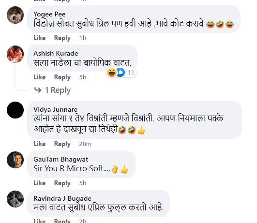 एकाने आता सुबोध भावे सत्या नाडेलाच्या बायोपिकमध्ये दिसणार अशी शंका उपस्थित केलीय. तर अन्य एकाने पुन्हा एकदा खरोखरच सुबोध मायक्रोसॉफ्टमध्ये नोकरी करणार असं समजून तो एप्रिल फूल बनवत असल्याची कमेंट केलीय.