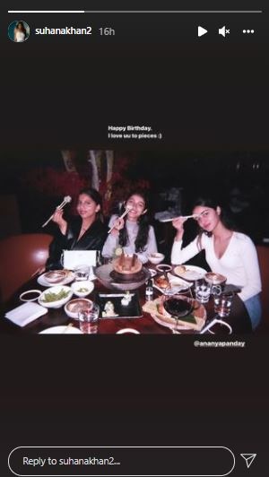 सुहानाने अनन्या आणि तिची बहिण रिसासोबतचा एक जुना फोटो शेअर करत तिला शुभेच्छा दिल्या आहेत. हा फोटो तिने इन्स्टास्टोरीला शेअर केलाय. या फोटोला कॅप्शन देत ती म्हणाली, “वाढदिवसाच्या शुभेच्छा, आय लव्ह यू टू पीस”. सुहानाने शेअर केलेला अनन्यसोबतचा हा फोटो सोशल मीडियावर चांगलाच व्हायरल होत आहे. या फोटोत तिघी एका रेस्टॉरन्टमध्ये बसलेल्या दिसत आहेत.