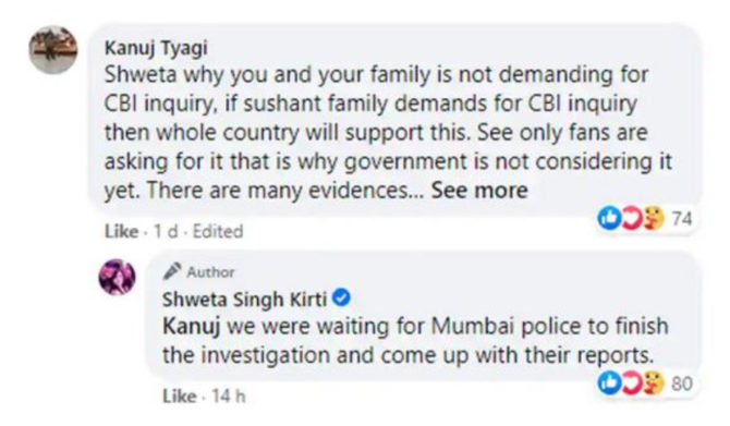 दरम्यान, मुंबई पोलिसांकडून तपास पूर्ण होण्याची वाट सुशांतचे कुटुंबीय करत असल्यामुळे अद्याप त्यांनी सीबीआय चौकशीची मागणी केलेली नाही हे श्वेताने स्पष्ट केलं आहे. परंतु, जर सुशांतच्या कुटुंबीयांनी सीबीआय चौकशीची मागणी केली तर चाहते त्यांना पाठिंबा देतील असंही नेटकऱ्यांनी म्हटलं आहे.