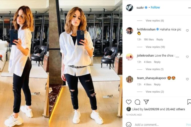 सुझानने तिच्या इन्स्टाग्राम अकाऊंटवर एक मिरर सेल्फी काढतानाचा फोटो शेअर केला आहे. या फोटोमध्ये तिने काळ्या रंगाची जीन्स आणि त्यावर पांढऱ्या रंगाचा शर्ट परिधान केला आहे. या लूकमध्ये ती सुंदर दिसत आहे. हा फोटो शेअर करत तिने ‘कधी कधी मला वाटते की मी मुलगा आहे’ या आशयाचे कॅप्शन दिले आहे.