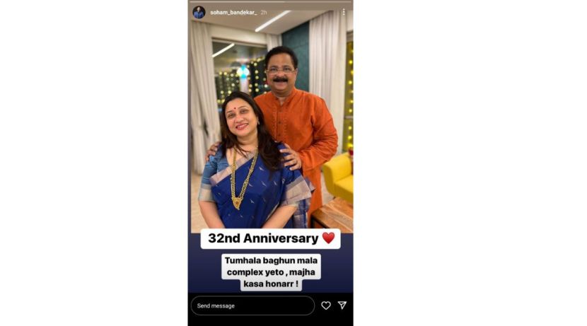 सोहमने आदेश व सुचित्रा यांचा एकत्रित फोटो शेअर करत म्हटलं की, “३२वा लग्नाचा वाढदिवस. तुम्हाला बघूनच मला कॉम्प्लेक्स येतो. माझं कसं होणार?” असं म्हणत सोहमने आपल्या आई-वडिलांना लग्नाच्या वाढदिवसाच्या शुभेच्छा दिल्या.