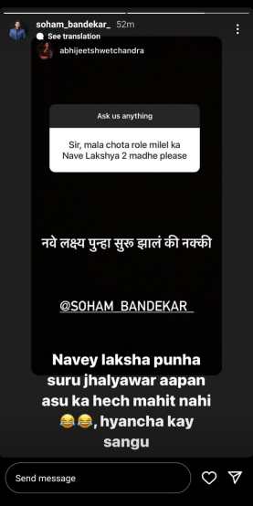 अभिजीत श्वेतचंद्रच्या एका चाहत्याने ‘नवे लक्ष्य’ या मालिकेबद्दल प्रश्न विचारला आहे. ‘सर मला नवे लक्ष्य २ मध्ये एखादे छोटे पात्र मिळेल का प्लीझ?’ असा प्रश्न एका चाहत्याने केला आहे. त्यावर अभिजीतने “नवे लक्ष्य पुन्हा सुरु झालं की नक्की”, असे उत्तर दिले आहे. त्याबरोबर त्याने सोहम बांदेकरलाही या पोस्टमध्ये टॅग केले आहे.