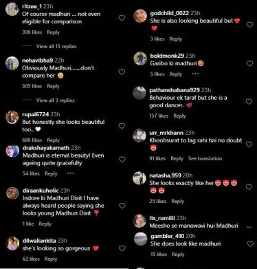 एका नेटकऱ्याने लिहिलं, “हिच्यापेक्षा माधुरी सुंदर दिसते. हिची तुलना करणं योग्य नाही.” तर दुसऱ्या नेटकऱ्याने लिहिलं, “हिची तुलना करू नका.” तसंच तिसऱ्या नेटकऱ्याने लिहिलं, “पण खरंच ही खूपच सुंदर दिसतेय.” चौथ्या नेटकऱ्याने लिहिलं आहे, “मीशोवरून माधुरीला मागवली आहे का?” पाचव्या नेटकऱ्याने लिहिलं आहे, “गरीबांची माधुरी.”