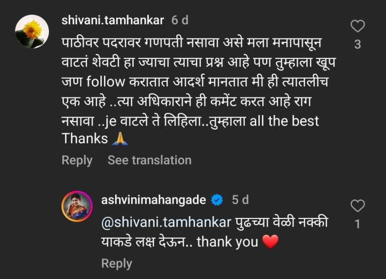 चाहतीची ही कमेंट अश्विनीने वाचली. त्यावर उत्तर देत अश्विनीने लिहिलं, “पुढच्या वेळी नक्की याकडे लक्ष देऊ. थँक यू.” तर आता चाहतीची ही कमेंट आणि त्यावर अश्विनीने दिलेलं उत्तर सर्वांचं लक्ष वेधून घेत आहे.