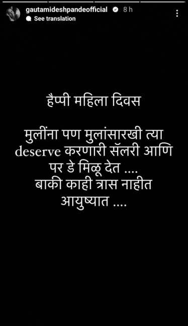 काल महिला दिनानिमित्त गौतमीने तिच्या इंस्टाग्राम अकाउंटवर एक स्टोरी पोस्ट केली आणि महिला दिनाच्या शुभेच्छा दिल्या. तिने लिहिलं, “महिला दिनाच्या शुभेच्छा! मुलींना पण मुलांसारखी त्या डिझर्व करत असलेली सॅलरी आणि पर डे मिळू देत…बाकी काही त्रास नाहीत आयुष्यात.”