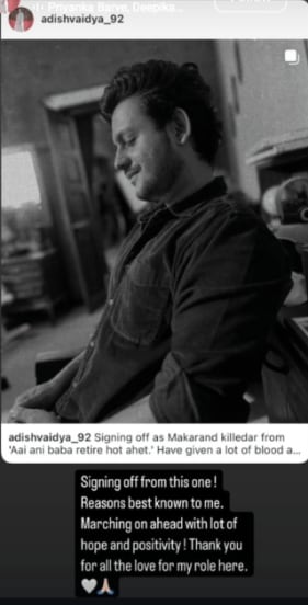अभिनेता आदिश वैद्यने सोशल मीडियावर एक पोस्ट शेअर करीत या ‘आई आणि बाबा रिटायर होत आहेत’ ही मालिका सोडत असल्याचे लिहिले. त्याने लिहिले, “या भूमिकेचा निरोप घेत आहे. त्याची कारणं मला चांगलीच माहीत आहेत. पुढे जाताना खूप आशा आणि सकारात्मकतेनं जातोय. माझ्या भूमिकेला दिलेल्या प्रेमाबद्दल खूप आभार.”