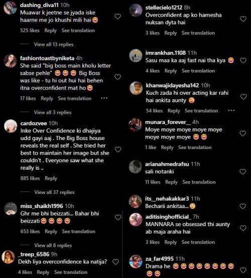 अंकिताच्या या व्हिडीओवर नेटकऱ्यांनी भरभरून प्रतिक्रिया दिल्या आहेत. काही नेटकऱ्यांनी तिला पाठिंबा दर्शवला आहे तर काही नेटकऱ्यांनी तिला ट्रोल केलं आहे. एका नेटकऱ्याने लिहिलं आहे, “मुनव्वर जिंकण्यापेक्षा ही हरल्यामुळे जो काही आनंद होतोय.” तर दुसऱ्या नेटकऱ्याने लिहिलं आहे, “अतिआत्मविश्वासचा परिणाम पाहिलात?” तसेच तिसऱ्या नेटकऱ्याने लिहिलं आहे, “घरीही अपमान बाहेरही अपमान.” चौथ्या नेटकऱ्याने लिहिलं आहे, “सासूबाईचा आज उपवास नव्हता का?”