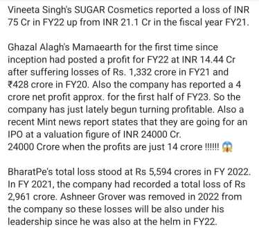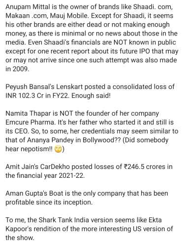 अंकित उत्तम याने लिंक्डइन या साइटवर एक पोस्ट शेअर केली. यात त्याने लिहिलं, “विनिता सिंग हिच्या ‘शुगर कॉस्मेटिक्स’ या कंपनीचं गेल्या वर्षी ७५ कोटींचं नुकसान झालं. पियुष बन्सल याच्या ‘लेन्सकार्ट’ या कंपनीला गेल्या वर्षी १०२.३ कोटींचा फटका बसला. अनुपम मित्तल हा शादी डॉट कॉम, मकान डॉट कॉम, मौज मोबाईल या कंपन्यांचा मालक आहे. पण त्याची शादी डॉट कॉमव्यतिरिक्त कोणतीही दुसरी कंपनी चालत नाहीये. गेल्या वर्षी शार्कच्या खुर्चीत बसलेल्या अमित जैन यांच्या ‘कार देखो’ या कंपनीला गेल्या वर्षी २४६.५ कोटींचा तोटा झाला.”