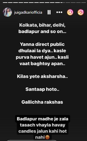 ‘ठरलं तर मग’ फेम अभिनेत्री जुई गडकरीने देखील इन्स्टाग्राम स्टोरी शेअर केली आहे. यामध्ये तिने लिहिलं आहे, ” कोलकाता, बिहार, दिल्ली, बदलापूर वगैरे…यांना डायरेक्ट पब्लिक धुलाईला द्या….कसले पुरावे हवे आहेत अजून…कसली वाट बघतोय आपण…किळस येते अक्षरशः…संताप होतो…गल्लिच्छ राक्षस…बदलापूरमध्ये ( Badlapur Sexual Assault Case ) जे झालं तसं व्हायला हवंय…कॅन्डल्स जाळून काही होत नाही.”