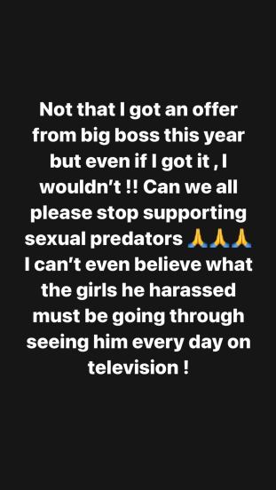उर्फी जावेदने तिच्या सोशल मीडिया अकाऊंद्वारे ‘बिग बॉस’च्या घरात साजिद खानला पाहून नाखूश असल्याचं म्हटलं आहे. उर्फीने तिच्या इन्स्टाग्रामवरून एक स्टोरी शेअर केली आहे. “’बिग बॉस’च्या यंदाच्या पर्वासाठी मला विचारण्यात आलं नाही. पण जरी मला ऑफर आली असती, तरी मी गेले नसते. लैंगिक अत्याचार करणाऱ्यांचं समर्थन करणं, आपण थांबवू शकत नाही का? ज्या महिलांचं त्याने(साजिद खान) शोषण केलं आहे. त्या महिलांना रोज त्याला टीव्हीवर पाहून काय वाटत असेल, याची कल्पनाही करता येत नाही”, असं उर्फी म्हणाली आहे.