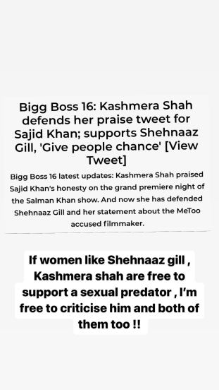 “शहनाज गिल आणि कश्मिरा शाहसारख्या महिला साजिद खानचं समर्थन करत असतील तर मलाही त्याच्यावर टीका करण्याचा अधिकार आहे”, असंही उर्फी म्हणाली आहे. २०१८ मध्ये साजिद खानवर महिलांवर लैंगिक अत्याचार केल्याचा आरोप करण्यात आला होता.