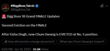 ‘बिग बॉस’च्या १८व्या पर्वाच्या चित्रीकरणाला सुरुवात झाल्यामुळे सतत नवनवीन अपडेट्स समोर येत आहेत. ईशा सिंह सहाव्या स्थानावरून बाद झाल्यानंतर आता आणखीन सदस्य ‘बिग बॉस’च्या स्पर्धेतून बाहेर गेल्याची माहिती मिळत आहे. ‘बिग बॉस तक’ या एक्स अकाउंटवरून दिलेल्या माहितीनुसार, महाअंतिम सोहळ्यातील दुसरं एविक्शन झालं आहे. ईशा सिंहनंतर चुम दरांगला पाचव्या स्थानावरून ‘बिग बॉस’च्या घराचा निरोप घ्यावा लागला आहे. रजत दलाल, अविनाश मिश्रा, करणवीर मेहरा आणि विवियन डिसेना टॉप-४ सदस्य ठरले आहेत.