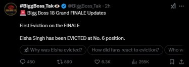 ‘बिग बॉस’च्या १८व्या पर्वाच्या महाअंतिम सोहळ्याच्या चित्रीकरणाला सुरुवात झाली असून मोठी अपडेट समोर आली आहे. ईशा सिंह एविक्ट झाल्याचं समोर आलं आहे. टॉप-५मध्ये आता अविनाश मिश्रा, चुम दरांग, करणवीर मेहरा, रजत दलाल आणि विवियन डिसेना हे सदस्य आहेत.