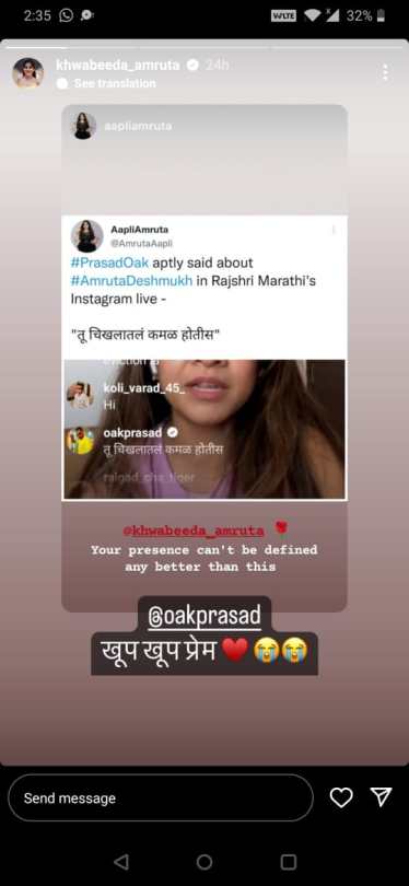 प्रसादने केलेली कमेंट पाहून अमृताने त्याचे आभार मानले.”प्रसाद ओक खूप खूप प्रेम” असं अमृताने म्हटलं. अमृताला कलाक्षेत्रामधील अनेक मंडळी पाठिंबा देत आहेत. तसेच तिने ‘बिग बॉस मराठी’च्या घरामध्ये असायला हवं असं प्रेक्षकही म्हणत आहेत.