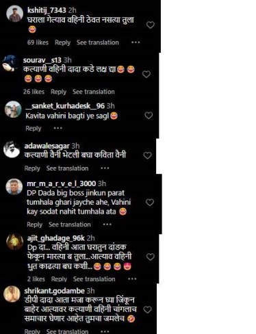 एका चाहत्याने लिहिलं आहे, “कल्याणी वहिनी भेटली बघा कविता वहिनी. कल्याणी वहिनीची सवत.” तर दुसऱ्या चाहत्याने लिहिलं आहे, “डीपीदा ‘बिग बॉस’ ( Bigg Boss Marathi ) जिंकून परत तुम्हाला घरी जायचं आहे. आता वहिनी तुम्हाला काही सोडत नाहीत.” तसंच तिसऱ्या चाहत्याने लिहिलं आहे, “डीपी दादा आता मजा करू घ्या. जिंकून बाहेर आल्यावर कल्याणी वहिनी तुमचा चांगलाच समाचार घेणार आहेत.”