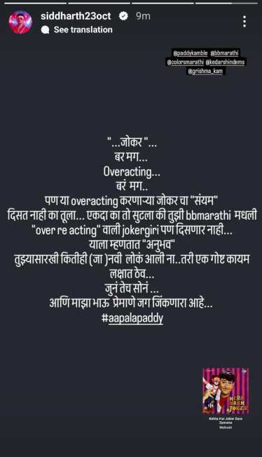 पंढरीनाथ कांबळेचा अपमान केल्यामुळे सिद्धार्थ जाधव देखील संतापला. त्याने इन्स्टाग्राम स्टोरीवर लिहिलं की, “…जोकर”…बरं मग…ओव्हर अॅक्टिंग…बरं मग..पण या ओव्हर अॅक्टिंग करणाऱ्या जोकरचा “संयम” दिसत नाही का तुला?…एकदा का तो सुटला की तुझी बिग बॉस मराठी मधली ओव्हर अॅक्टिंग वाली जोकरगिरी पण दिसणार नाही…याला म्हणतात “अनुभव” तुझ्यासारखी कितीही (जा)नवी लोकं आली ना…तरी एक गोष्ट कायम लक्षात ठेव…जुनं तेच सोनं…आणि माझा भाऊ प्रेमाने जग जिंकणार आहे.