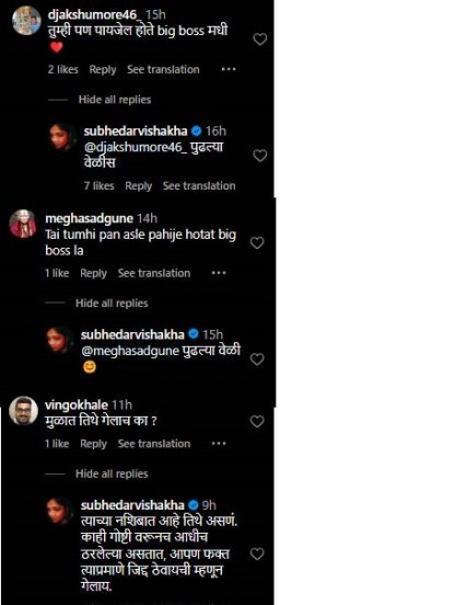 विशाखा सुभेदारची ही पोस्ट सध्या चांगलीच व्हायरल झाली आहे. या पोस्टवर तिच्या अनेक चाहत्यांनी प्रतिक्रिया दिल्या आहेत. ‘बिग बॉस मराठीमध्ये ( Bigg Boss Marathi ) तुम्ही पाहिजे होता’, असं काही चाहत्यांनी प्रतिक्रियेतून म्हटलं आहे. त्यावर विशाखा म्हणाली, “पुढच्या वेळेस.” तसंच एका चाहत्याने लिहिलं आहे, ‘मुळात तिथे गेलाच का?’ यावर विशाखा म्हणाली, “तिथे असणं त्याच्या नशिबात आहे. काही गोष्टी वरूनच आधीच ठरलेल्या असतात. आपण फक्त त्याप्रमाणे जिद्द ठेवायची म्हणून गेलाय.”